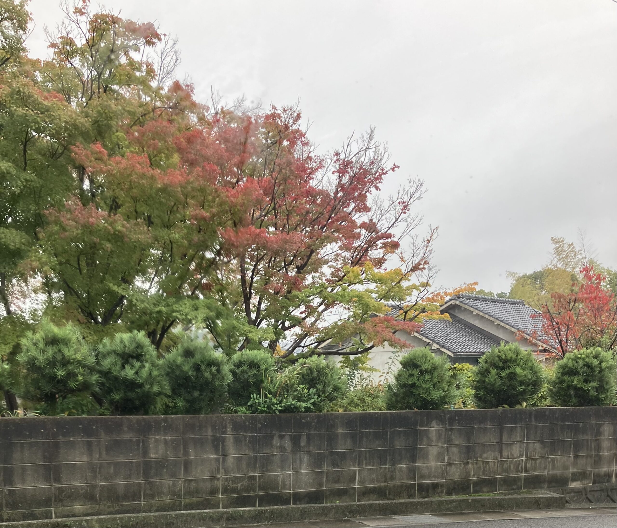 今日は雨で少し霞んだ空に、赤や緑の葉がしっとりと映えていました。