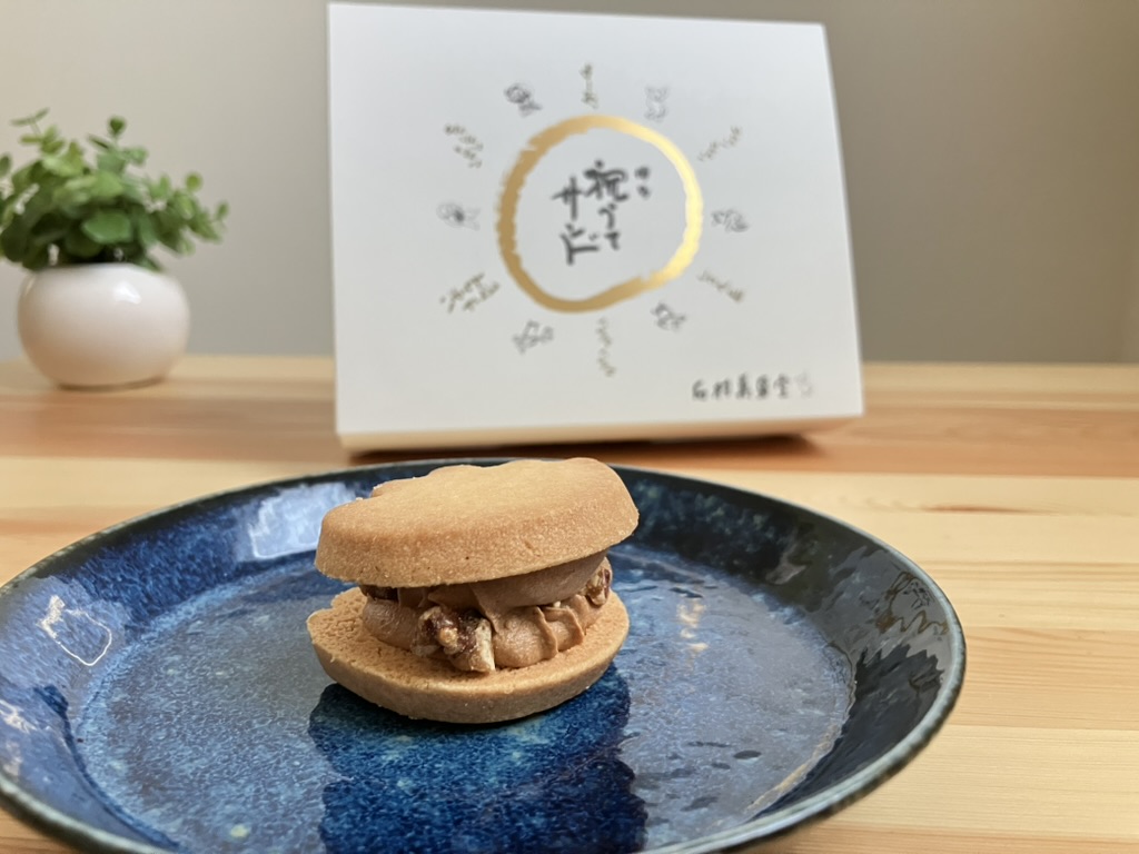お祝いの「博多手一本」に由来した、手のひら型のクッキーサンドです。